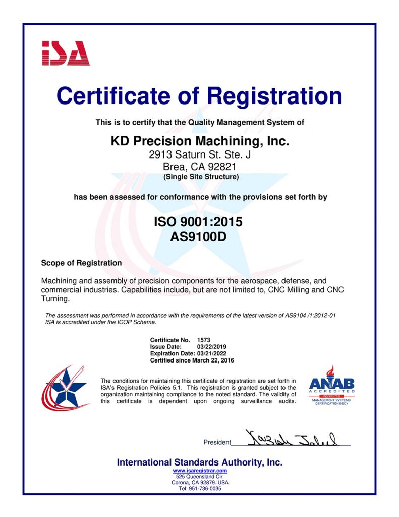 At KD Precision Machining we believe that what sets us apart from all our competition is our superior quality. We are committed to providing the highest quality product and service to meet and exceed all of our customers’ needs and expectations. We adhere to specific procedures and protocol which meet the strictest AS9100 Rev D, ISO 9001:2015 standards.