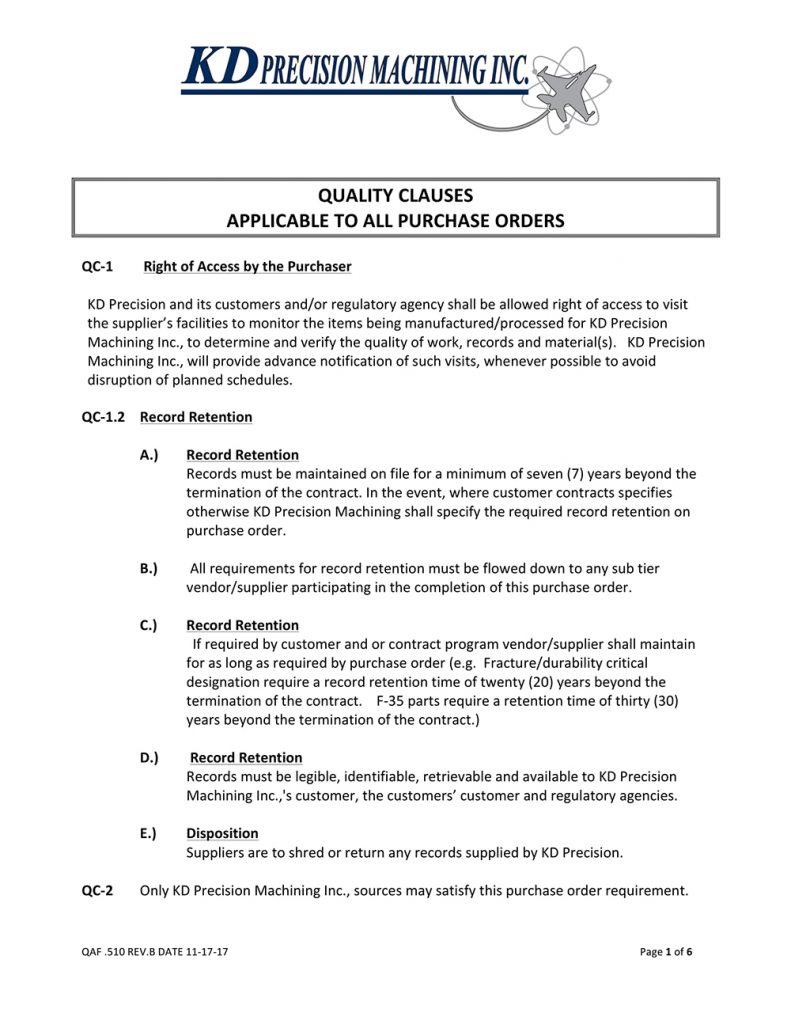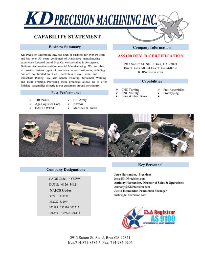 Quality Policy: “KD precision is committed to provide the highest quality and service to meet and exceed all of our customer and regulatory requirements. This is achieved through continuous improvements of our quality management system and monitoring of our measurable quality objectives.”